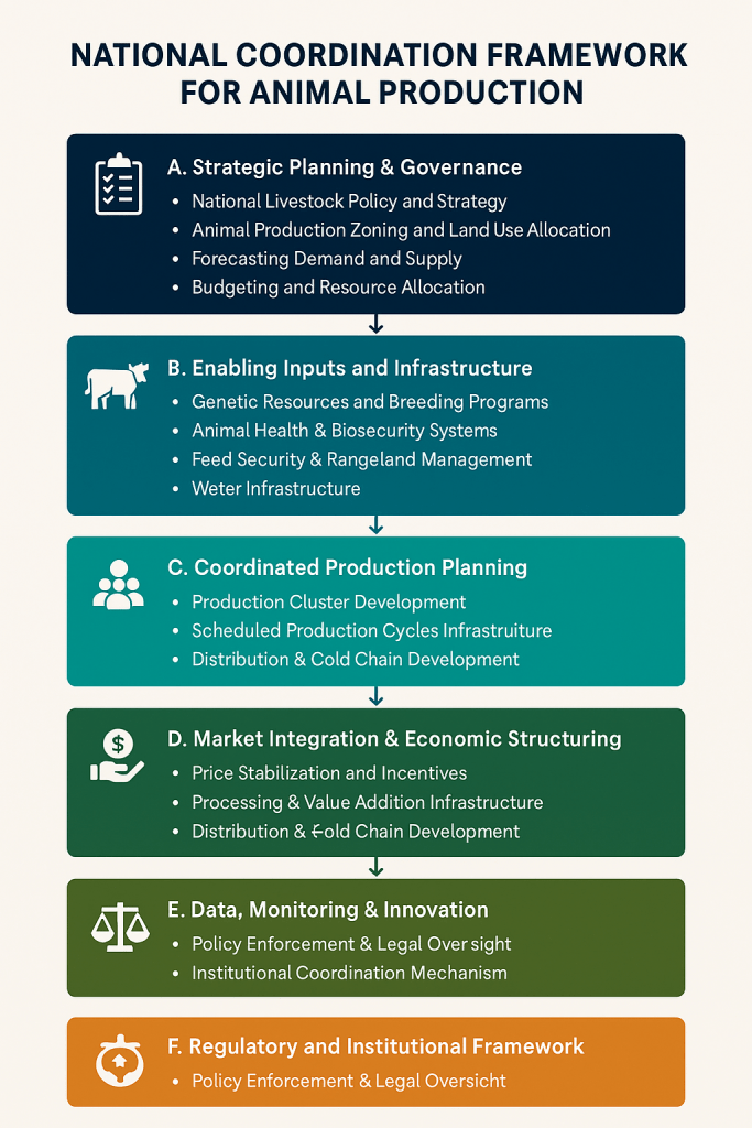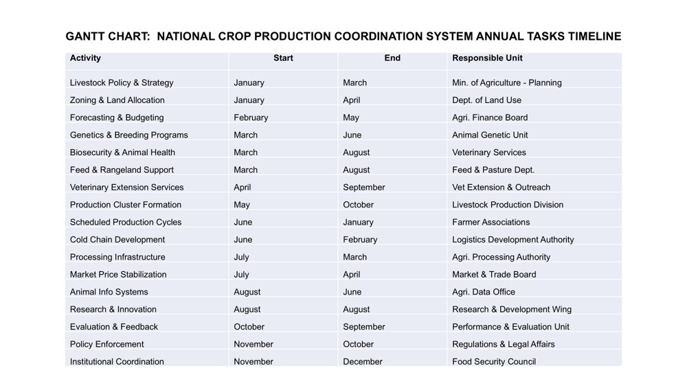 Establish a central, data-driven national agricultural coordination system. It will synchronize planning across input supply, production, logistics, processing, and markets. This system will guide seasonal priorities, production quotas, investment, and climate-resilient land use planning across regions.