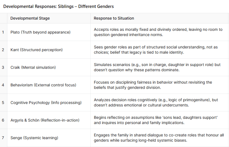 The situation for Siblings – Different Genders is now mapped with its mental model, self-discipline practice, and responses across the seven developmental stages. The structure continues seamlessly, showing how rigid gender roles can be sustained or challenged depending on the dominant mental model framework at play.