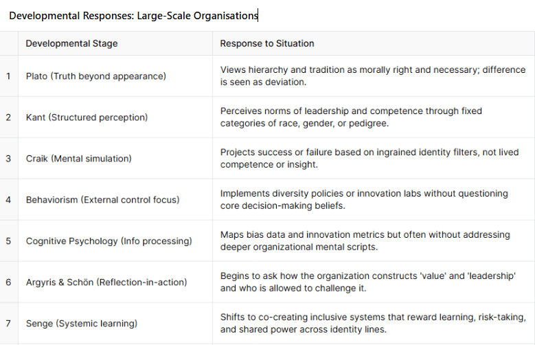The developmental map for Large-scale Organisations is now complete. It shows how entrenched biases and resistance to innovation are upheld by unseen mental models—and how each stage offers different capacities to address or perpetuate them.