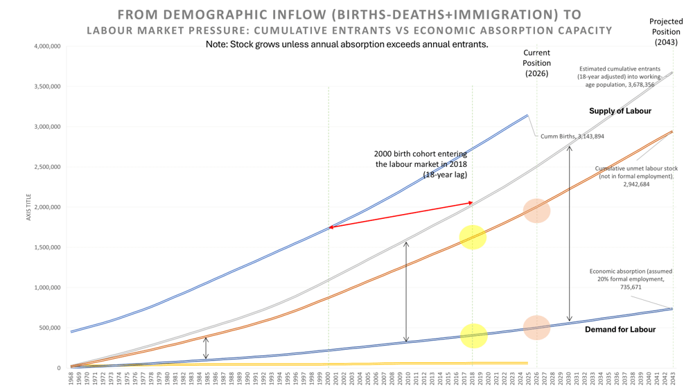 The Absorption Gap: There is no built-in pathway to absorb the growing workforce into formal, productive sectors.