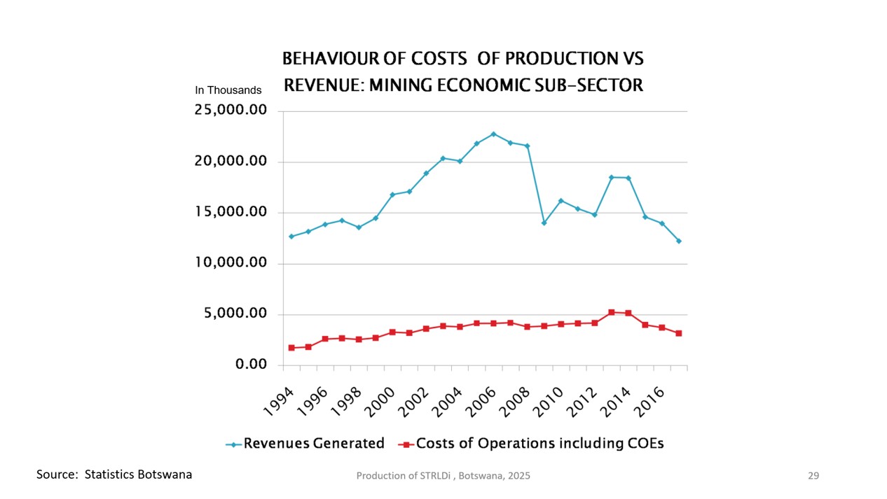 Once the backbone of Botswana’s economy, the mining sector has faced growing volatility since the 2008 global financial crisis. Revenues have fluctuated, and lab-grown diamonds are gaining ground with global consumers due to their lower cost. While a recovery remains possible as global markets improve, the sector has shown no sustained growth over the past two decades. This prolonged uncertainty underscores the urgent need for economic diversification and greater investment in industries that offer long-term stability and resilience.