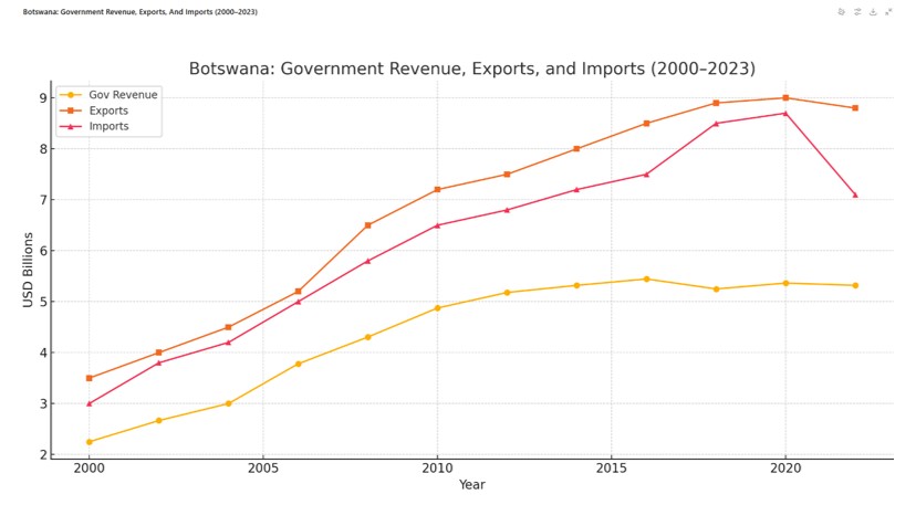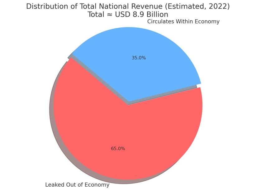 In estimating the leakage, if we treat total exports (≈ USD 8.9 billion) as a proxy for total revenue, and combine import spending with factors like profit repatriation, external contract payments, and debt service, a conservative estimate suggests that at least 60–80% of this national income leaves the country. That means only 20–40% of what Botswana earns circulates internally—supporting government wages, local consumption, and limited domestic procurement. In 2022, for example, government revenue stood around USD 5.5 billion, while import bills were higher still at USD 8.7 billion—making imports roughly 158% of revenue. This points to a structural imbalance where even sovereign income is insufficient to retain wealth domestically.