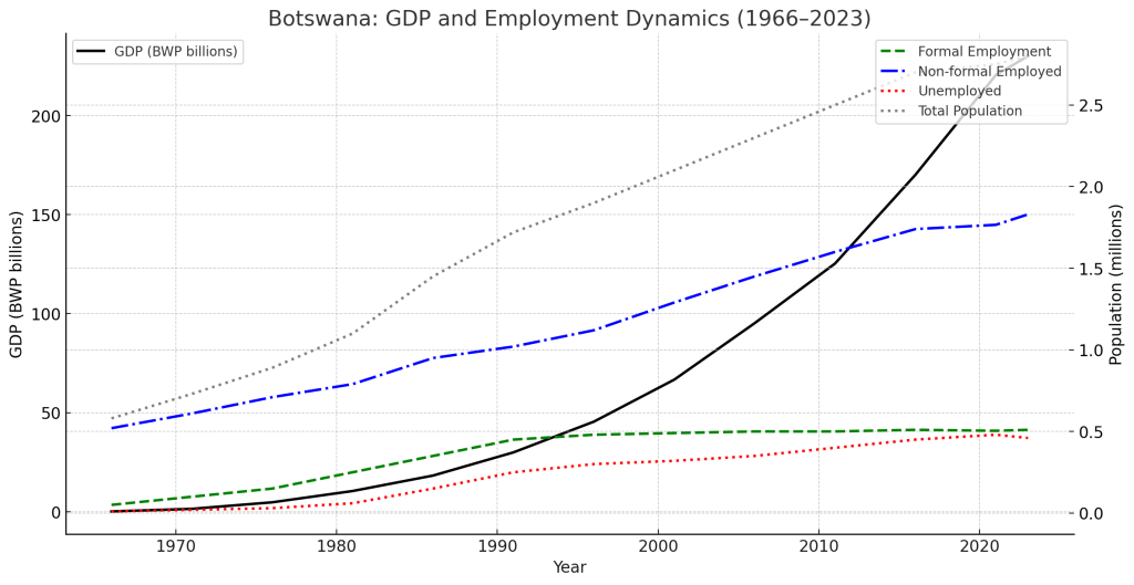 “Over five decades, Botswana has attracted billions in investment and international aid. The country has built infrastructure, expanded education access, and grown GDP per capita. Yet unemployment continues to rise, and the economy feels increasingly unable to absorb the talents of its people.”