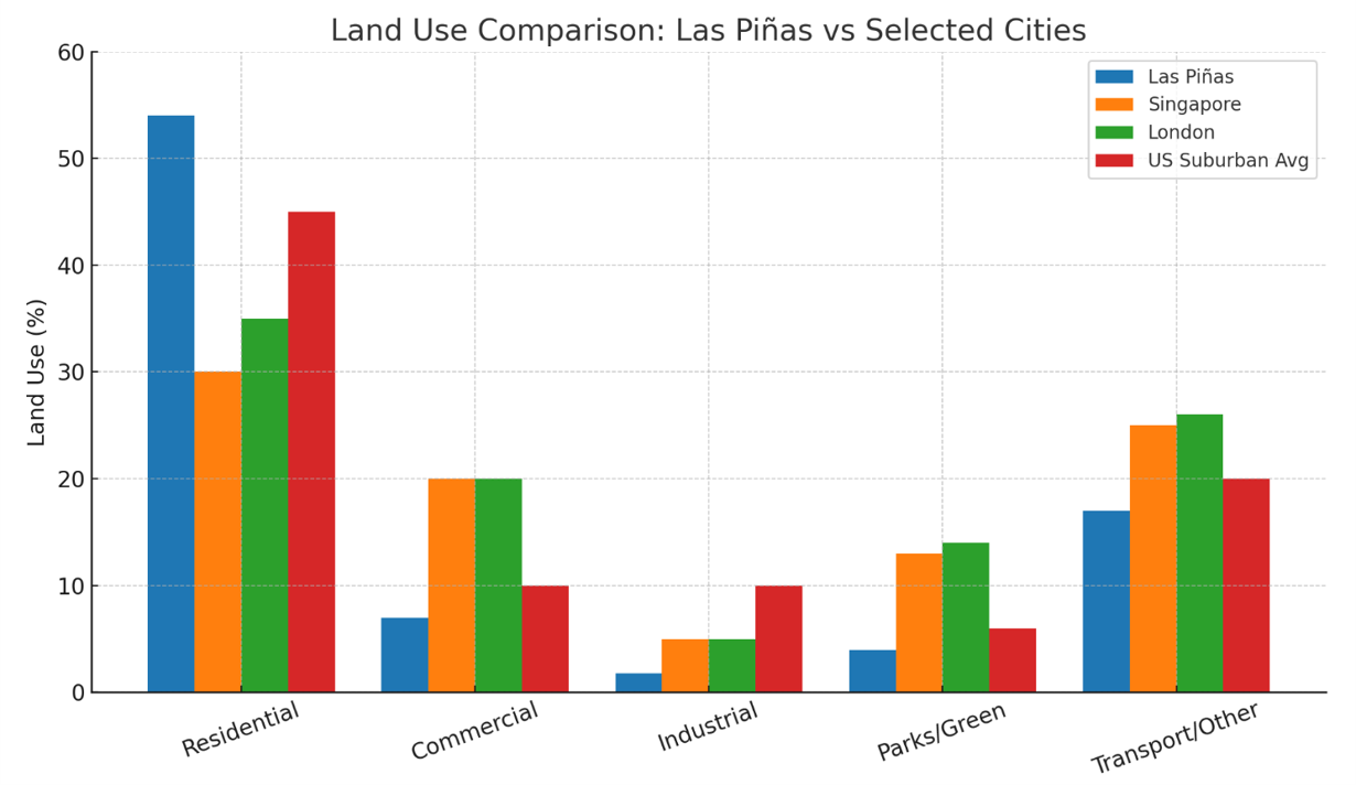 - Las Piñas: ~54% of land is residential (2020), projected to reach nearly 57% by 2030.