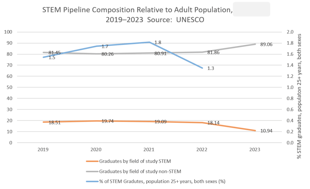These proportions reflect tertiary-educated populations, meaning even fewer within the broader labour force possess the hard science and technical skills required for scaling production and industrial competitiveness.