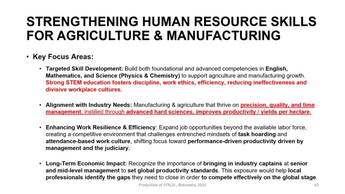 This learning gap carries serious consequences for Botswana’s broader economic aspirations. The manufacturing and agriculture sectors—critical to national productivity—depend on a technically skilled workforce proficient in mathematics, science, and language. Without a strong STEM pipeline, these sectors remain underdeveloped, with low profitability and a limited base of competent talent to scale operations. If current trends persist, the absence of foundational male-led household balance will widen the STEM gap, constraining Botswana’s ability to build resilient, innovation-driven value chains in agriculture and manufacturing—further entrenching unemployment and economic fragility.