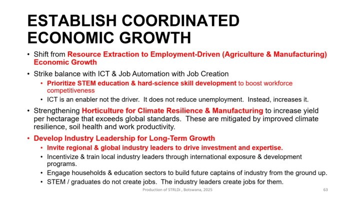 Sustainable economic growth depends on strong industry leadership. It involves attracting regional and global experts to drive investment. Additionally, it requires incentivizing and training local leaders through international exposure and development programs. Also, engaging households is critical. Involving the education sector is essential for nurturing future industry leaders. Job creation is ultimately driven by leadership, not STEM graduates alone.