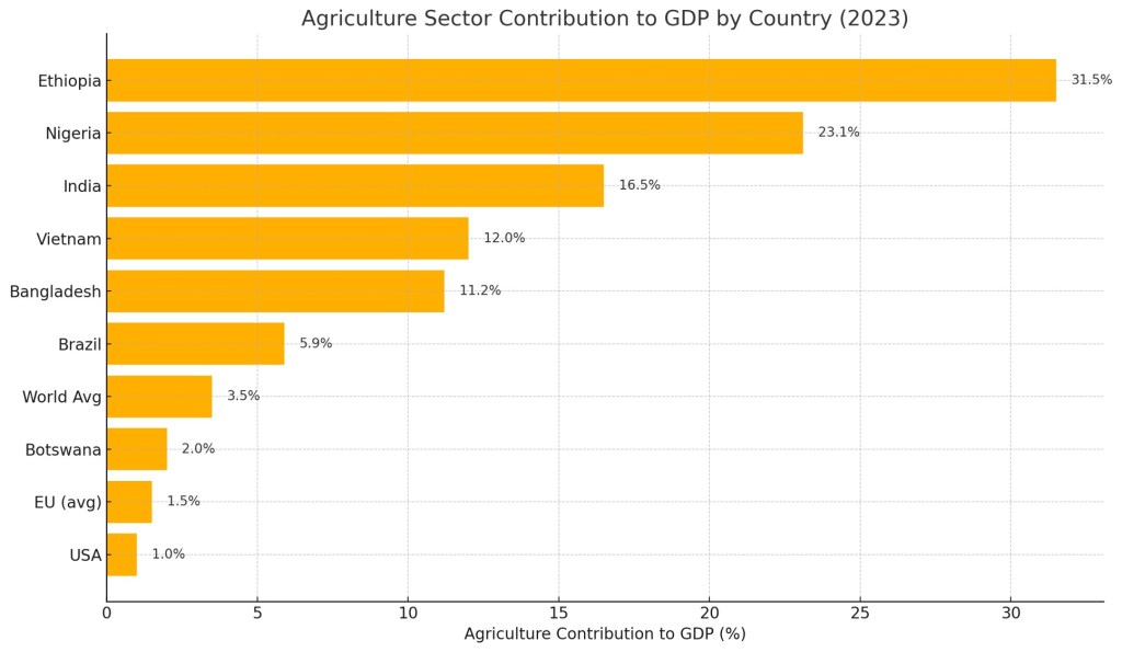 Here is a visual comparison of agriculture’s contribution to GDP across selected countries in 2023:
