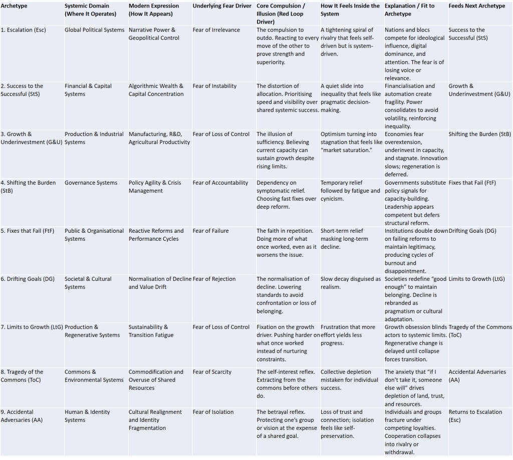 | 1. Escalation (Esc) | Global Political Systems | Narrative Power & Geopolitical Control | Fear of Irrelevance | The compulsion to outdo. Reacting to every move of the other to prove strength and superiority. | A tightening spiral of rivalry that feels self-driven but is system-driven. | Nations and blocs compete for ideological influence, digital dominance, and attention. The fear is of losing voice or relevance. | Success to the Successful (StS) |